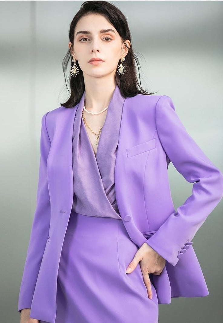 Indulge in the luxurious elegance of our Lavender Three Piece Skirt Suit Set. Made from the finest,...